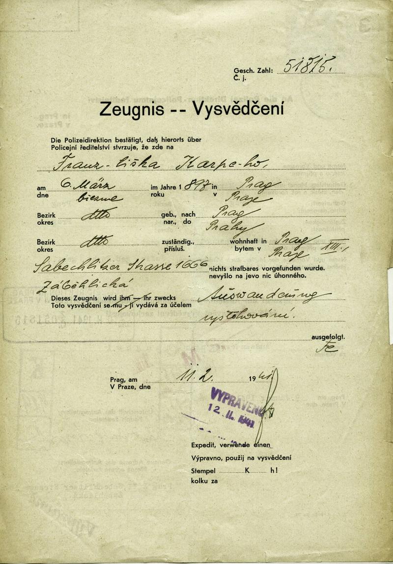 For publication purposes, contact the National Archives in Prague, where the original document is located. The document was digitized by the Terezín Initiative Institute, the Terezín Album project