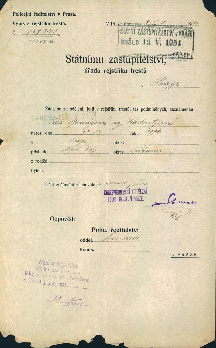 Nationalarchiv Prag > Polizei-Direktion Prag > 1931-1940 > B > Bondyová Ida