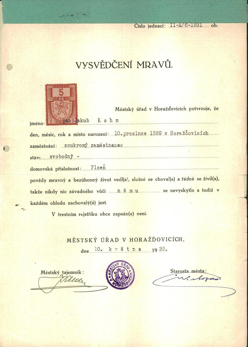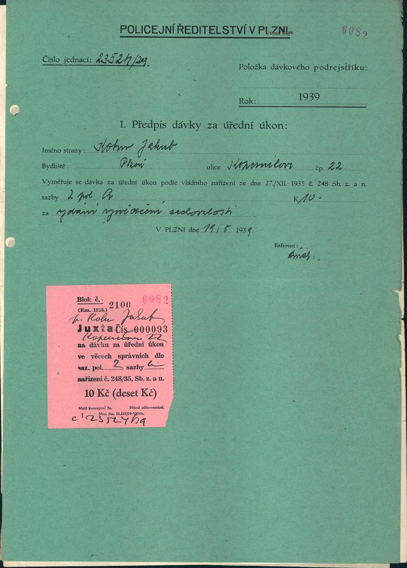Staatliche Gebietsarchiv in Pilsen > Polizei-Direktion Pilsen > 1918-1951 > K > Kohn Jakub