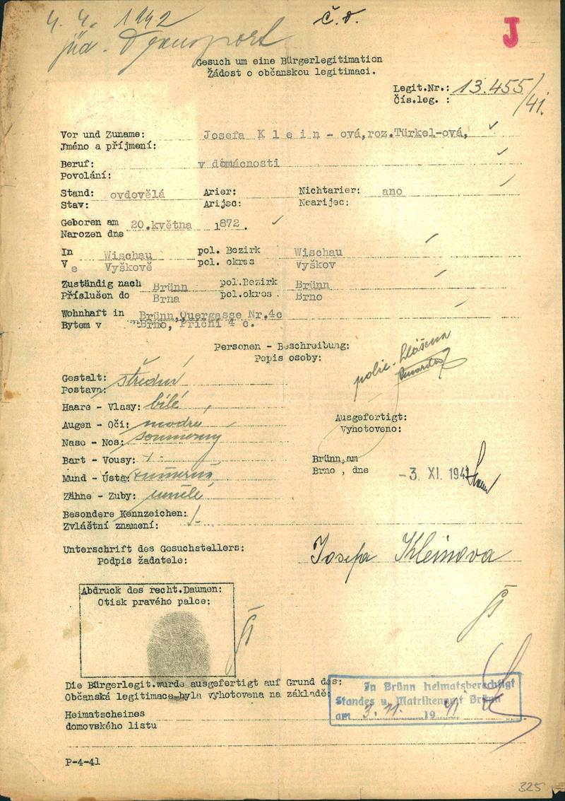 Moravský zemský archiv Brno > Policejní ředitelství Brno > Žádosti židovských občanů určených k transportu o občanské legitimace > Kleinová Josefa