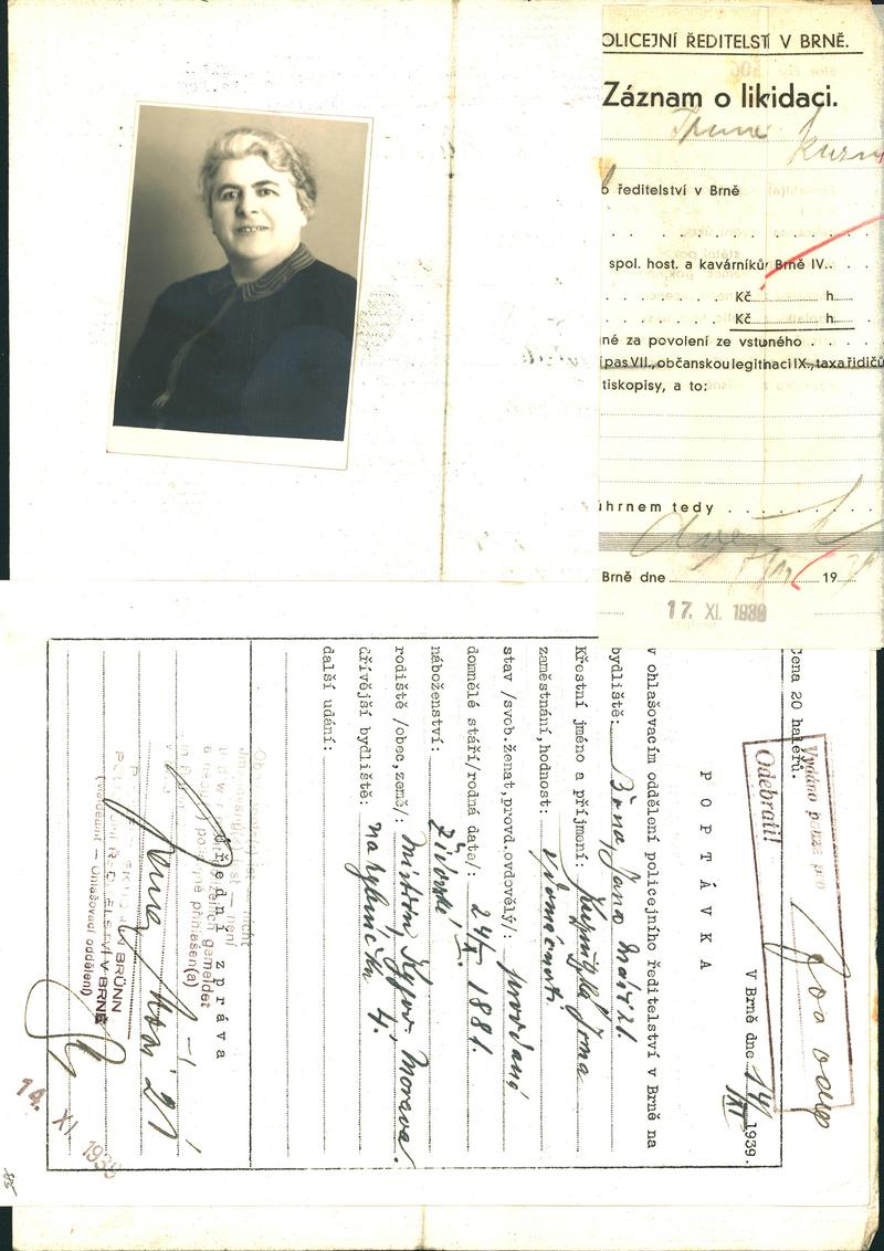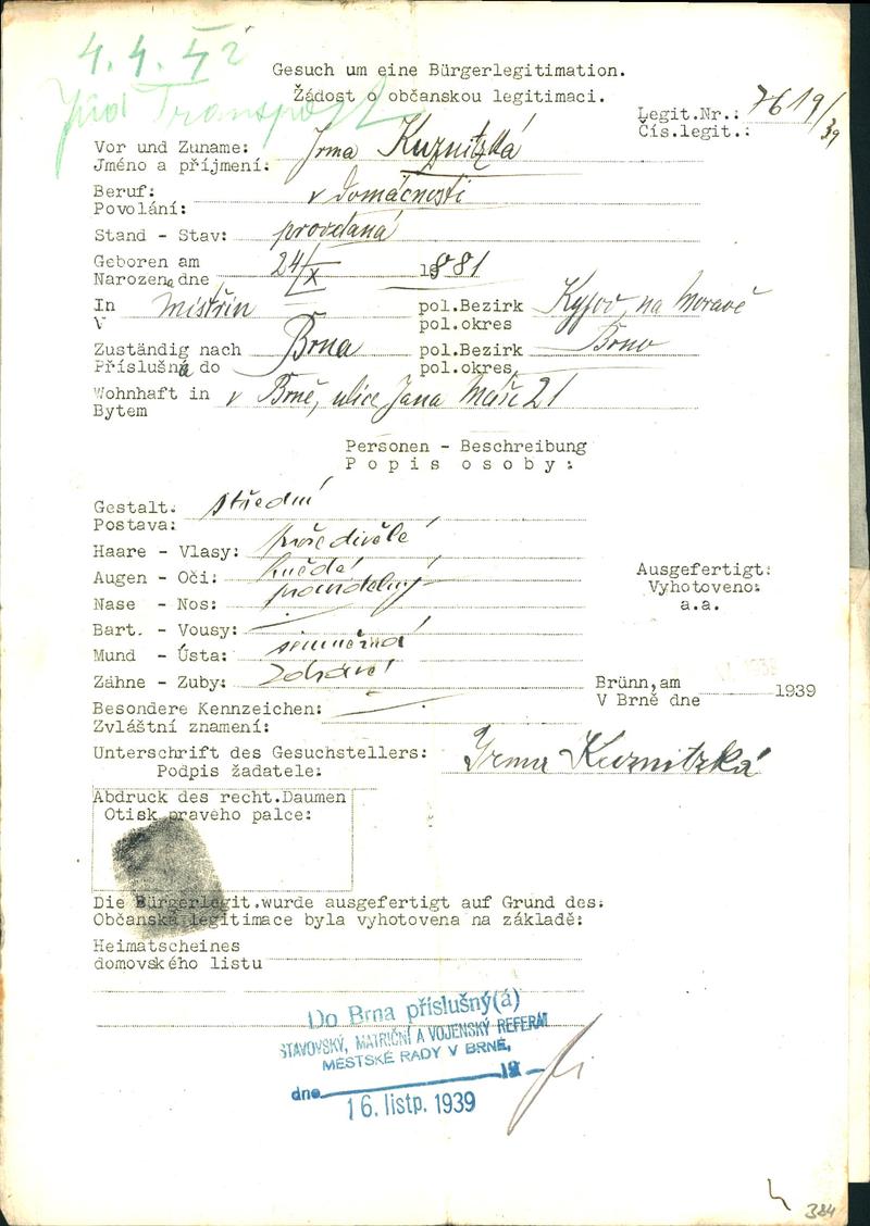Moravský zemský archiv Brno > Policejní ředitelství Brno > Žádosti židovských občanů určených k transportu o občanské legitimace > Kuznitzká Irma