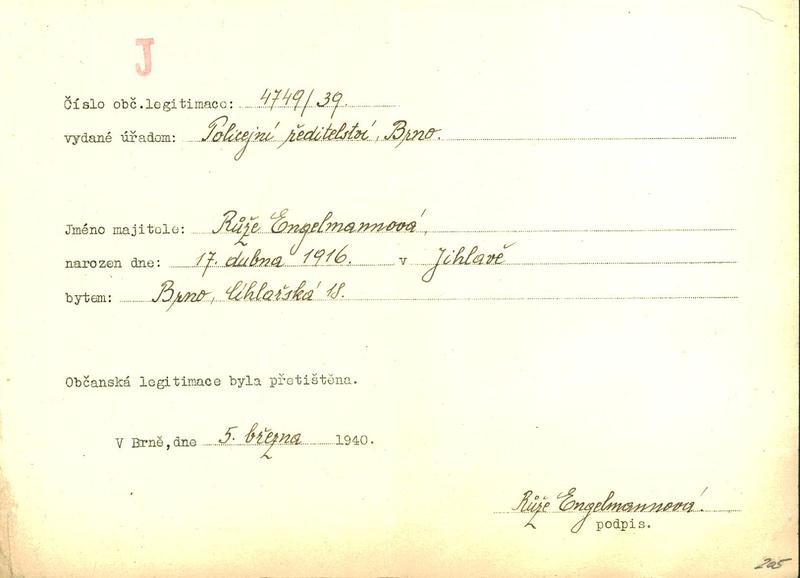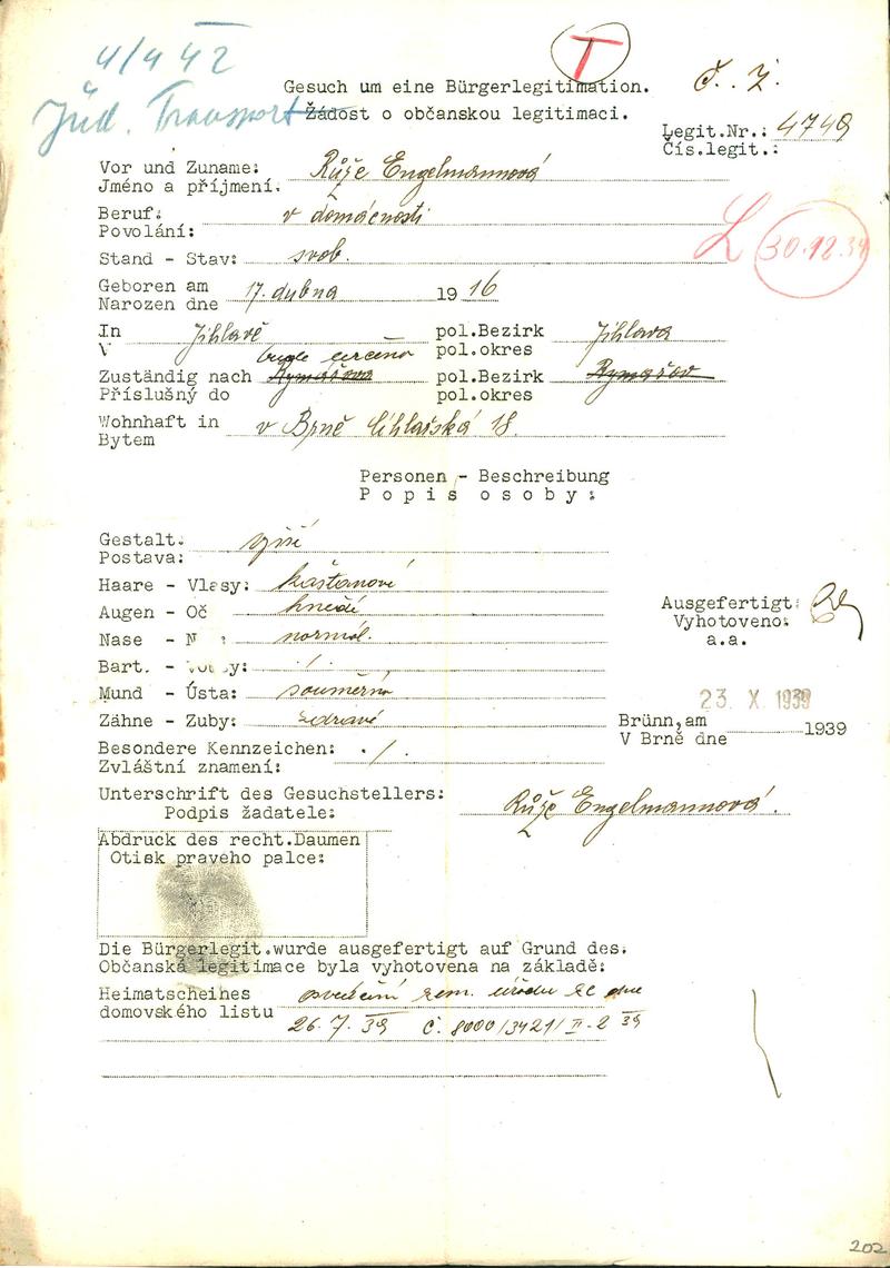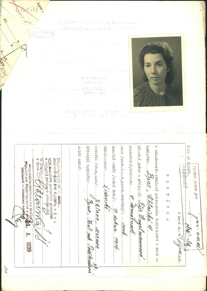 Moravský zemský archiv Brno > Policejní ředitelství Brno > Žádosti židovských občanů určených k transportu o občanské legitimace > Engelmannová Růžena