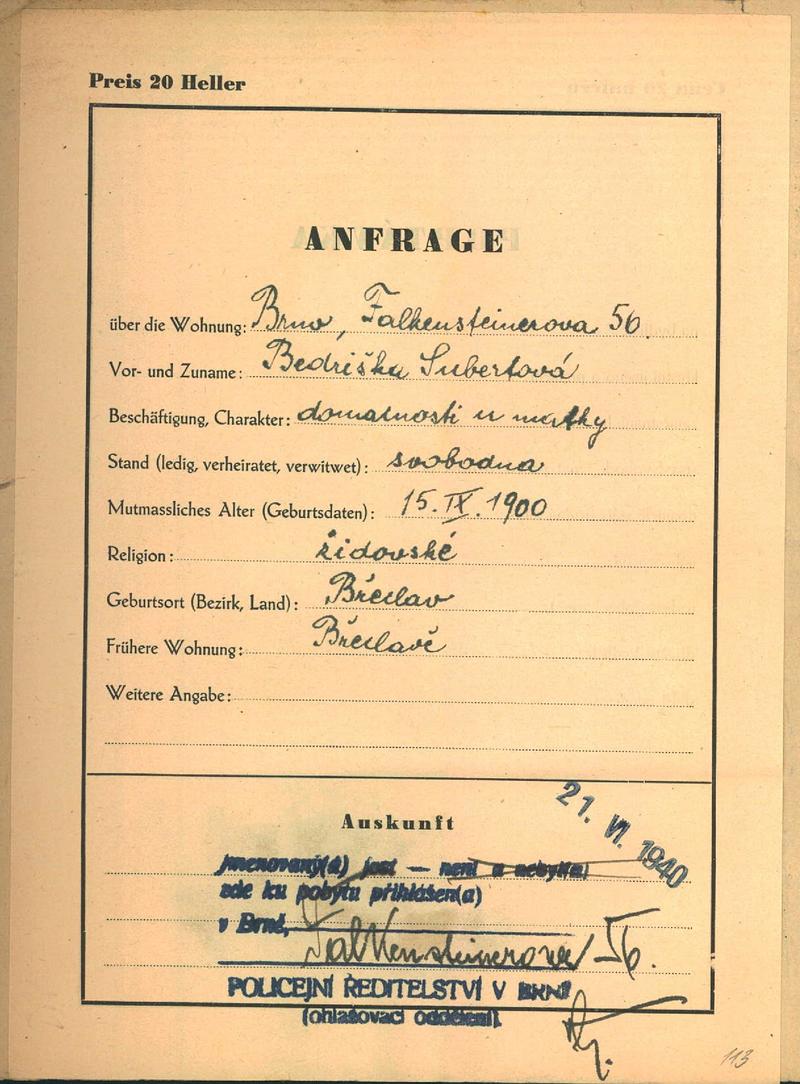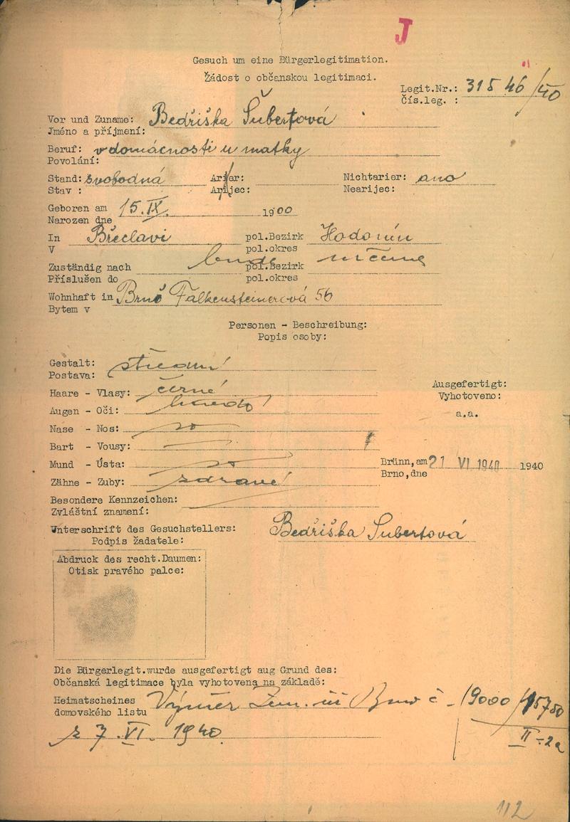 Moravský zemský archiv Brno > Policejní ředitelství Brno > Dodatky > Žádosti židovských občanů určených k transportu o občanské legitimace > Subertová Bedřiška