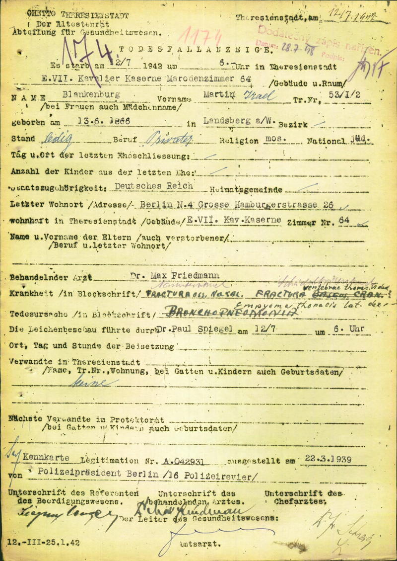 Blankenburg Martin: Todesfallanzeige, Ghetto Theresienstadt