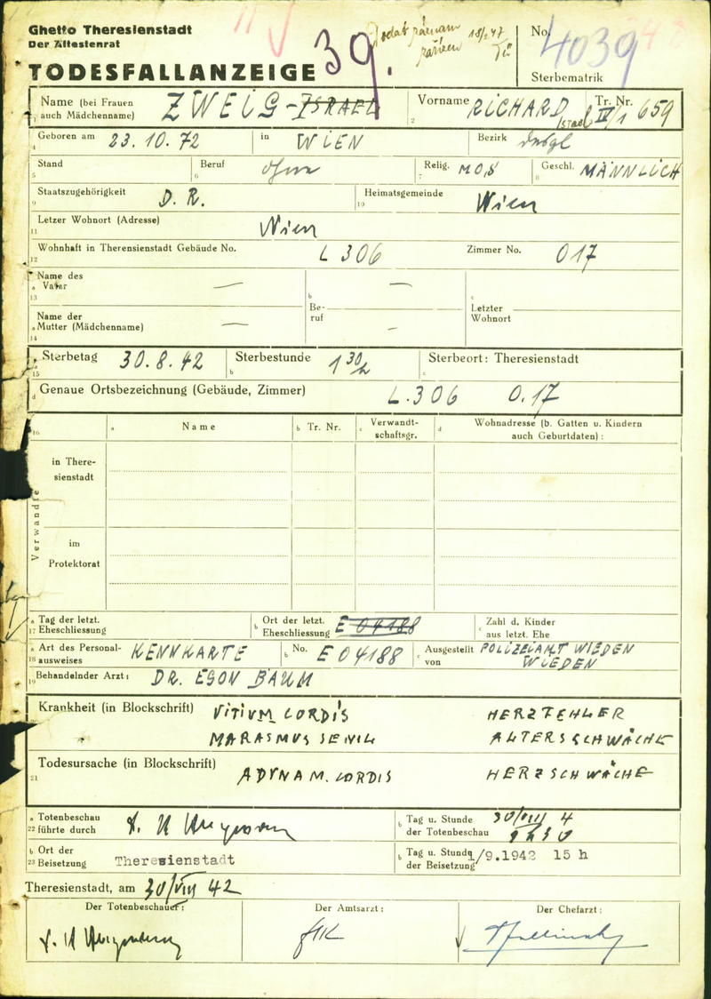 Zweig Richard: Todesfallanzeige, Ghetto Theresienstadt
