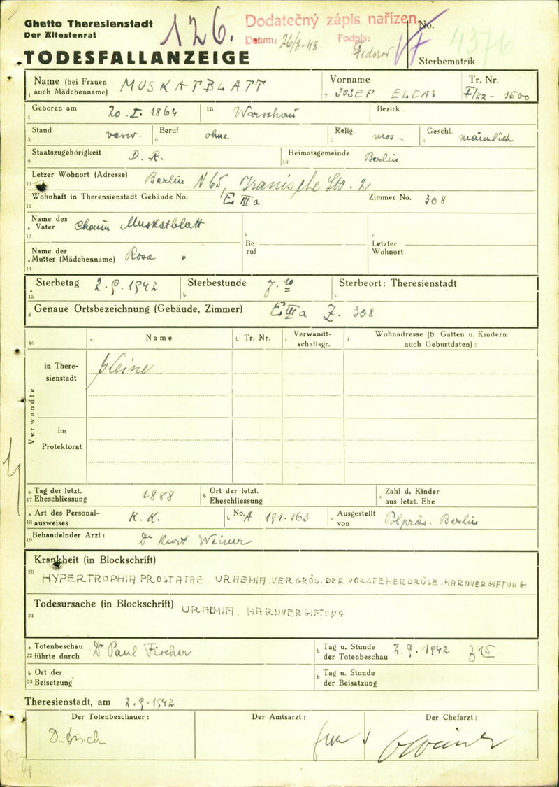 Muskatblatt Josef: Todesfallanzeige, Ghetto Theresienstadt