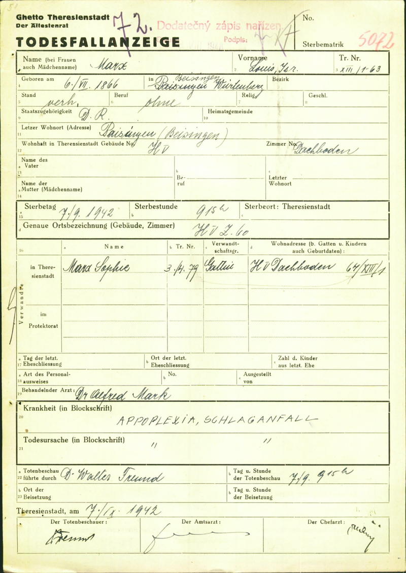 Marx Louis: Todesfallanzeige, Ghetto Theresienstadt