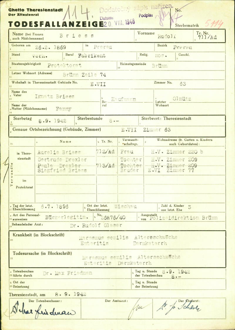 Briess Rudolf: Todesfallanzeige, Ghetto Theresienstadt