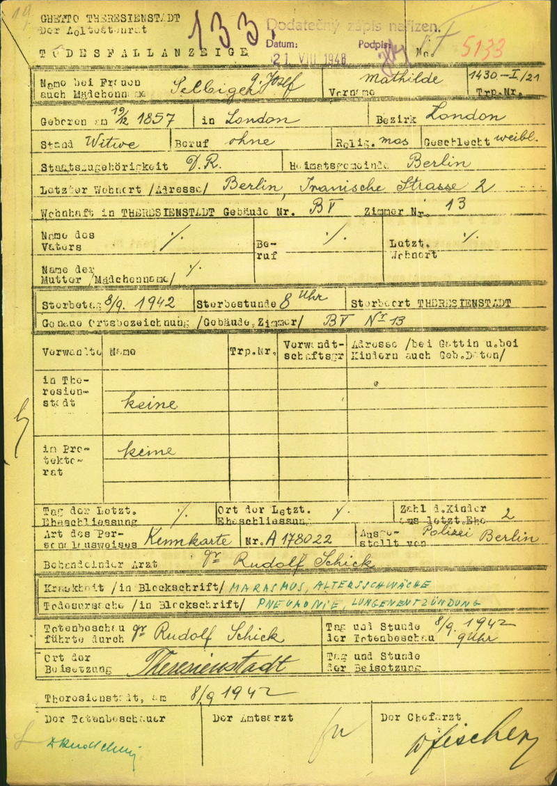 Selbiger Mathilde: Todesfallanzeige, Ghetto Theresienstadt