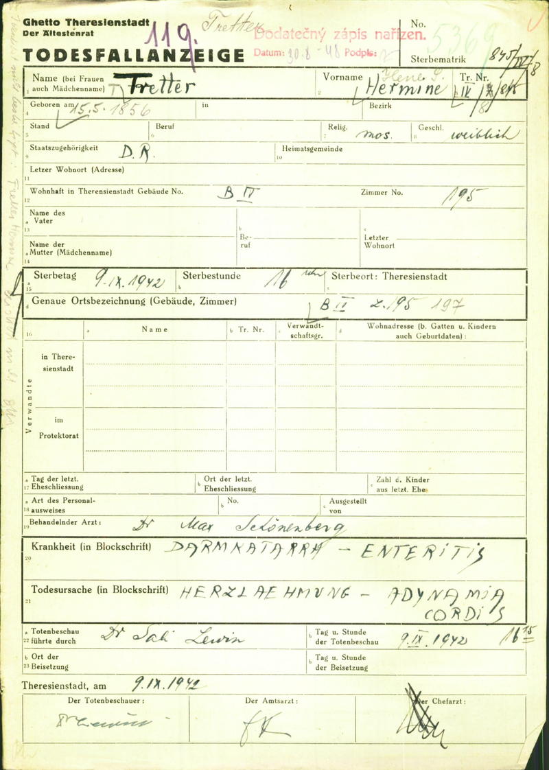 Tretter Helene Gusta: Todesfallanzeige, Ghetto Theresienstadt