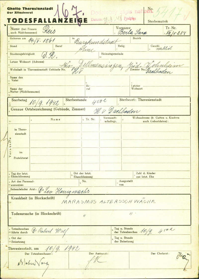 Reis Bertha: Todesfallanzeige, Ghetto Theresienstadt