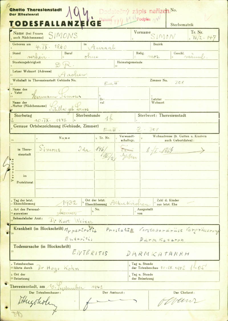 Simons Simon: Todesfallanzeige, Ghetto Theresienstadt