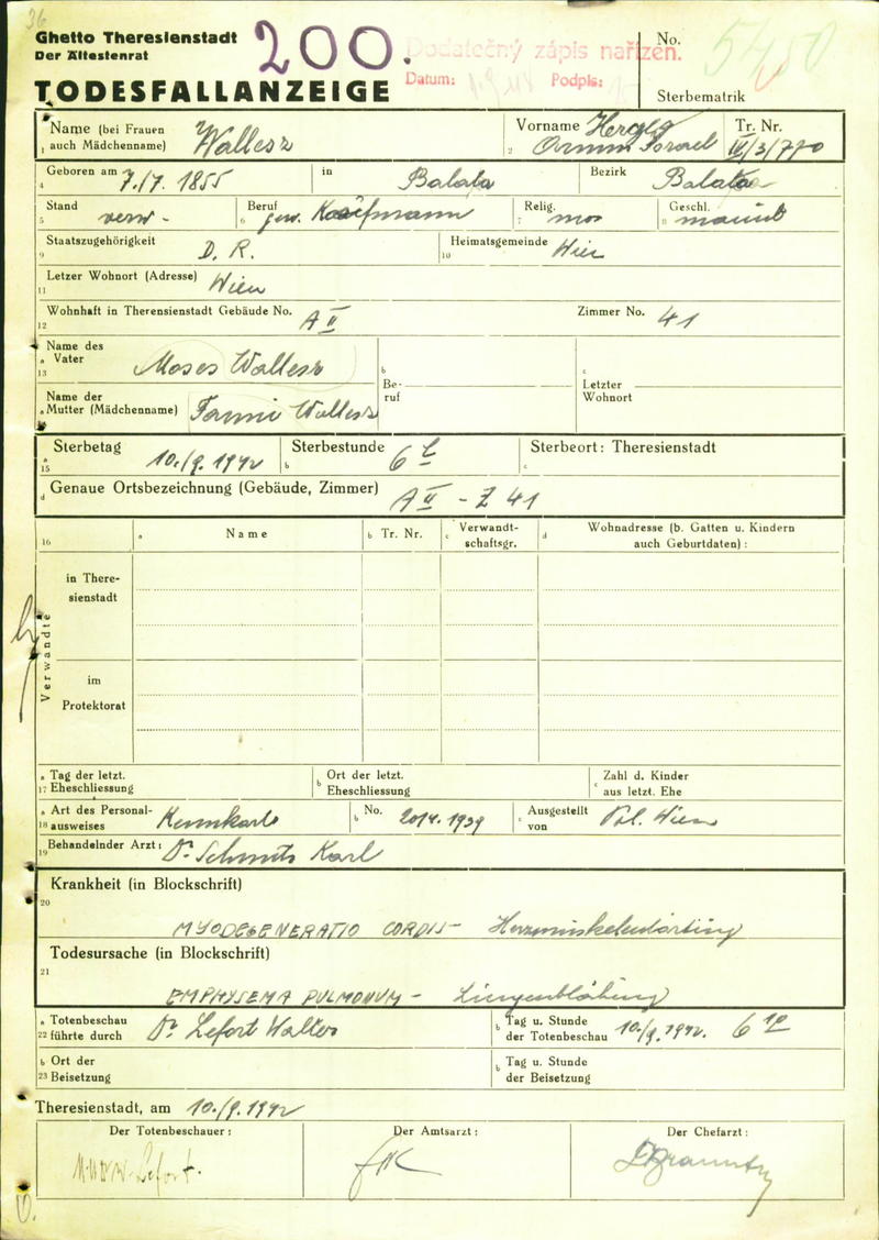 Wallesz Armin Herczeg: Todesfallanzeige, Ghetto Theresienstadt