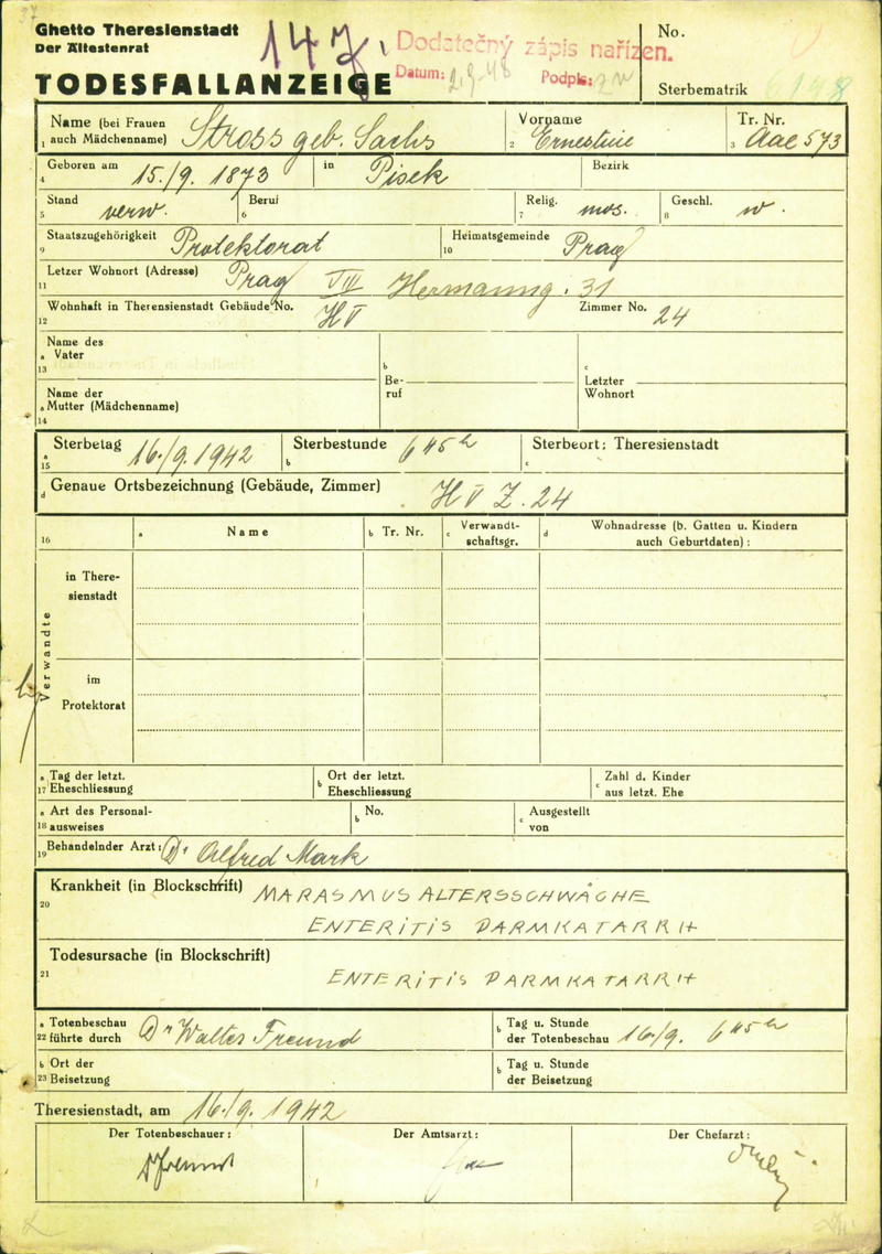 Strossová Ernestina: Todesfallanzeige, Ghetto Theresienstadt