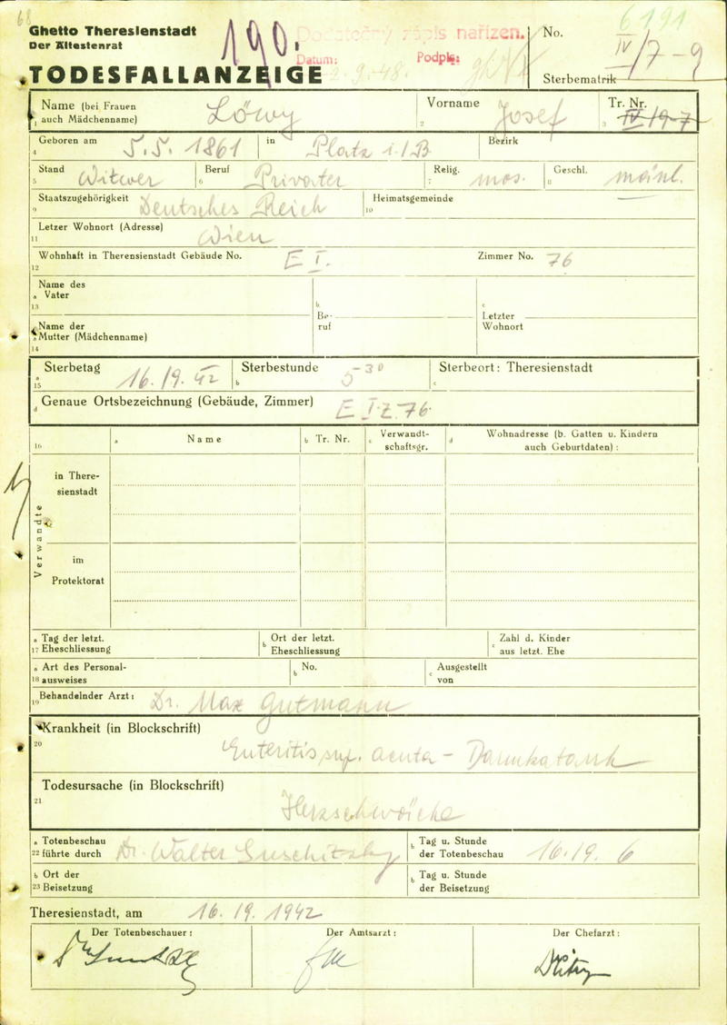 Löwy Josef: Todesfallanzeige, Ghetto Theresienstadt
