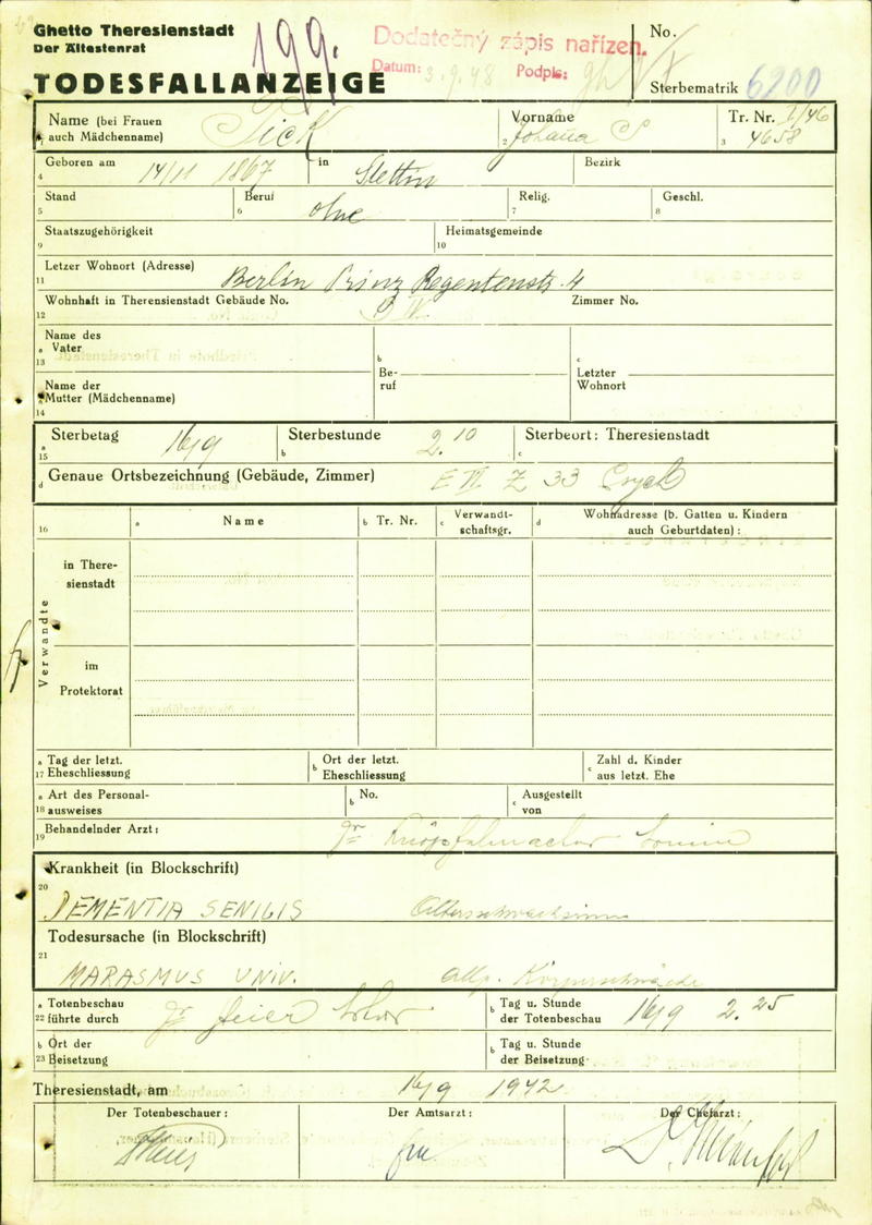 Pick Johanna: Todesfallanzeige, Ghetto Theresienstadt