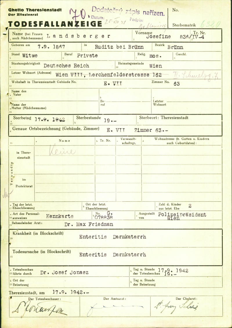 Landsberger Josefine: Todesfallanzeige, Ghetto Theresienstadt
