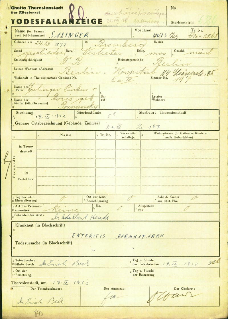 Salinger Louis: Todesfallanzeige, Ghetto Theresienstadt
