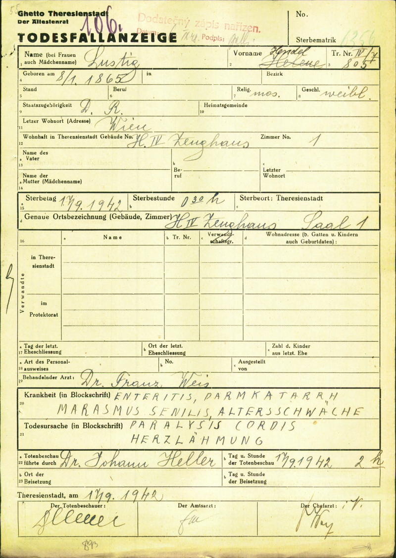 Lustig Hendel: Todesfallanzeige, Ghetto Theresienstadt