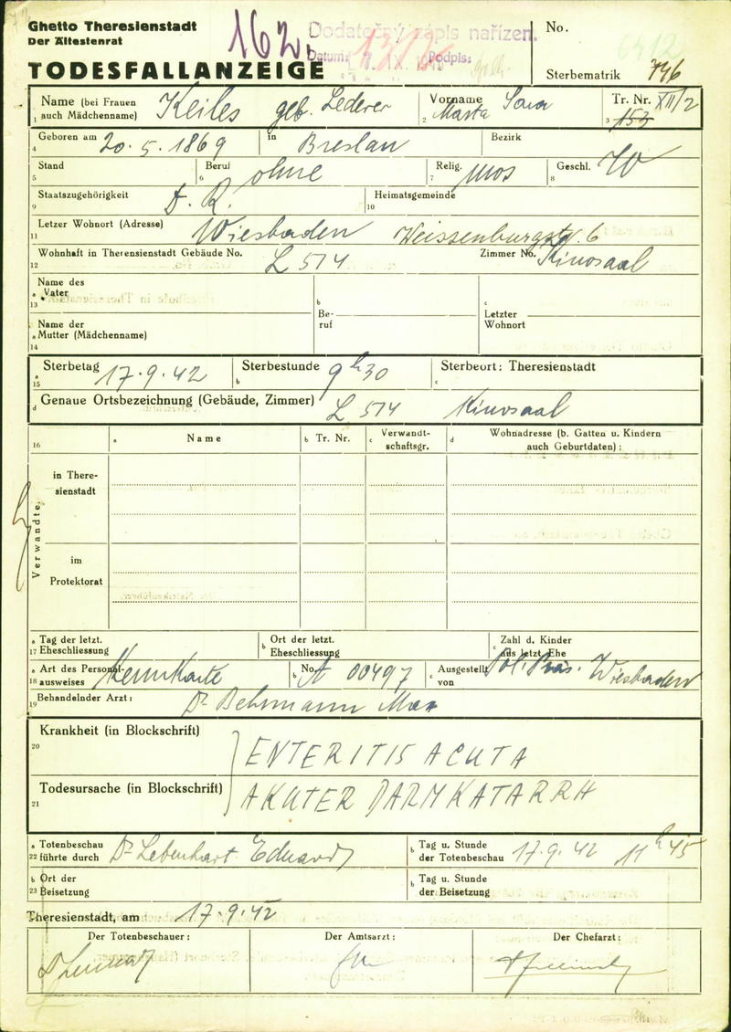 Keiles Marta: Todesfallanzeige, Ghetto Theresienstadt