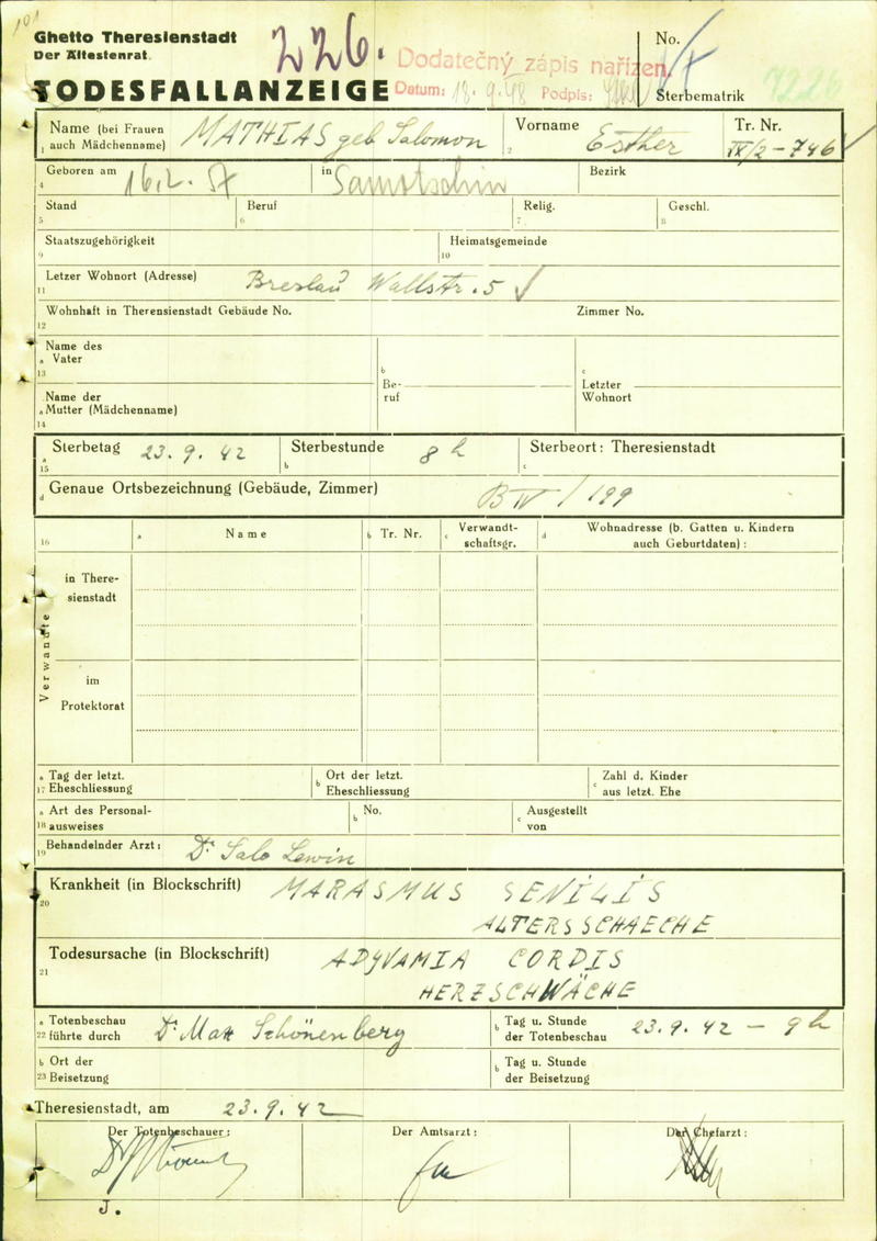 Mathias Esther: Todesfallanzeige, Ghetto Theresienstadt