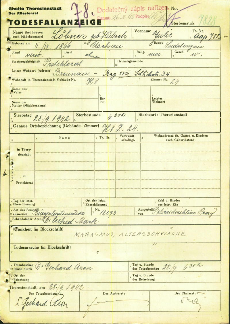 Löbnerová Julie: Todesfallanzeige, Ghetto Theresienstadt