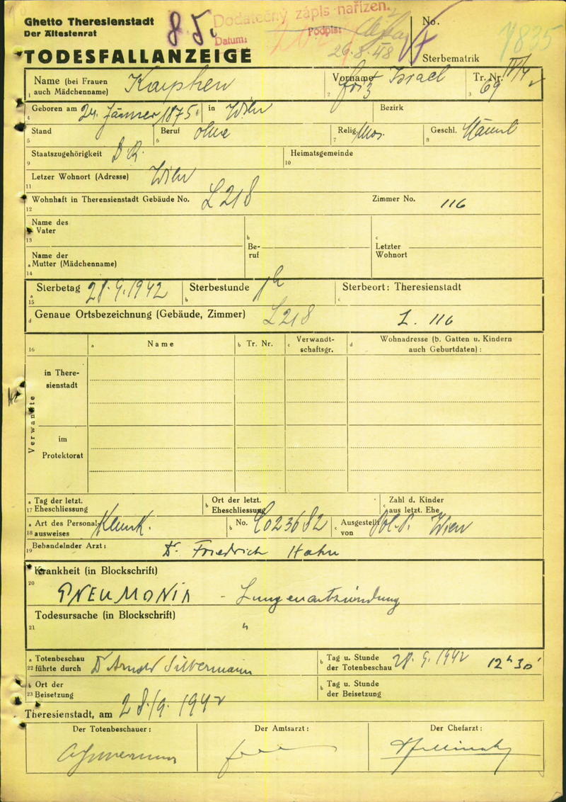 Karpfen Fritz: Todesfallanzeige, Ghetto Theresienstadt