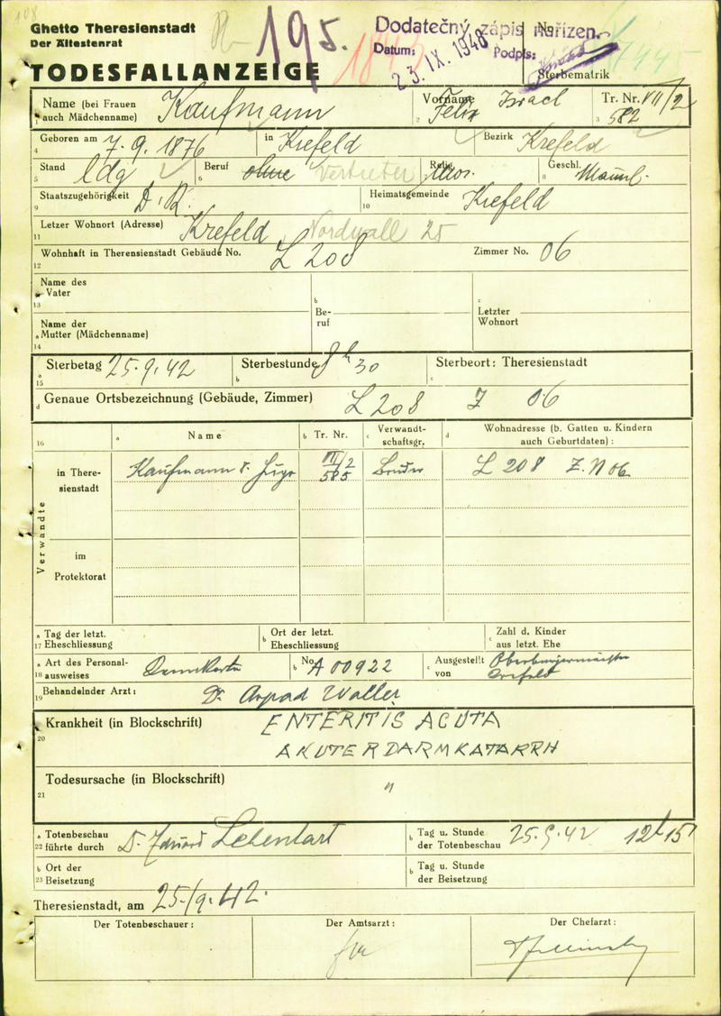 Kaufmann Felix: Todesfallanzeige, Ghetto Theresienstadt