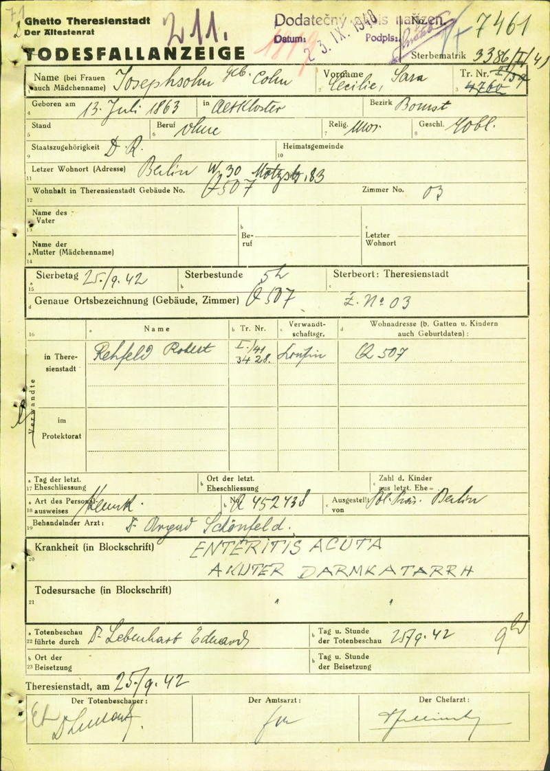 Josephsohn Cäcilie: Todesfallanzeige, Ghetto Theresienstadt