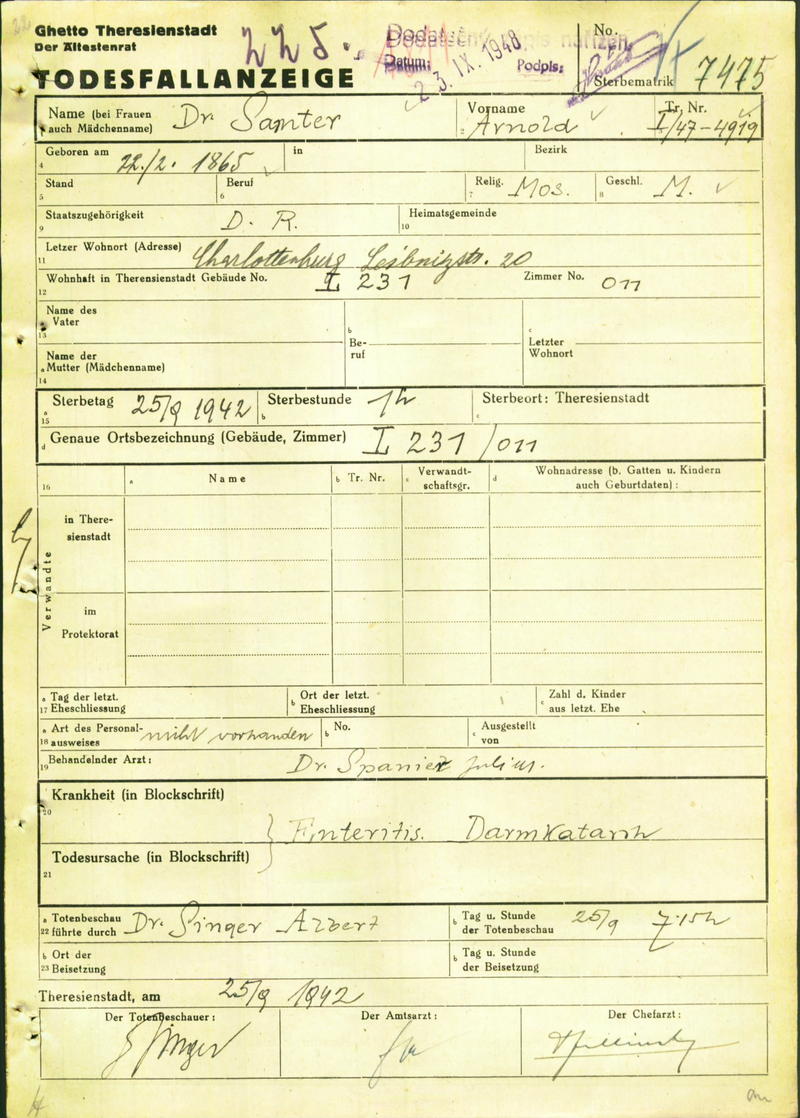 Samter Johann Arnold: Todesfallanzeige, Ghetto Theresienstadt