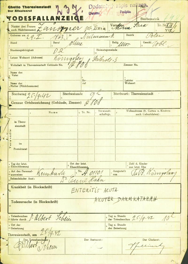 Zausner Minna: Todesfallanzeige, Ghetto Theresienstadt
