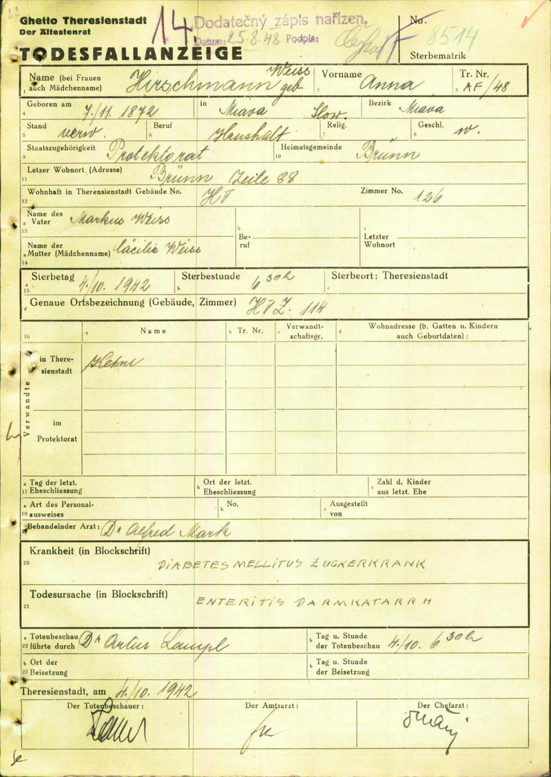 Hirschmannová Anna: Todesfallanzeige, Ghetto Theresienstadt