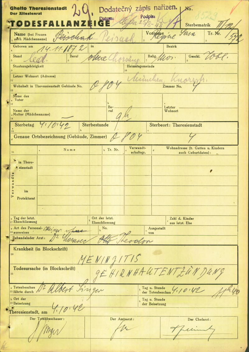 Peisach Regine: Todesfallanzeige, Ghetto Theresienstadt
