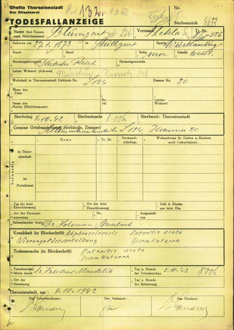Blumgart Thekla: Todesfallanzeige, Ghetto Theresienstadt