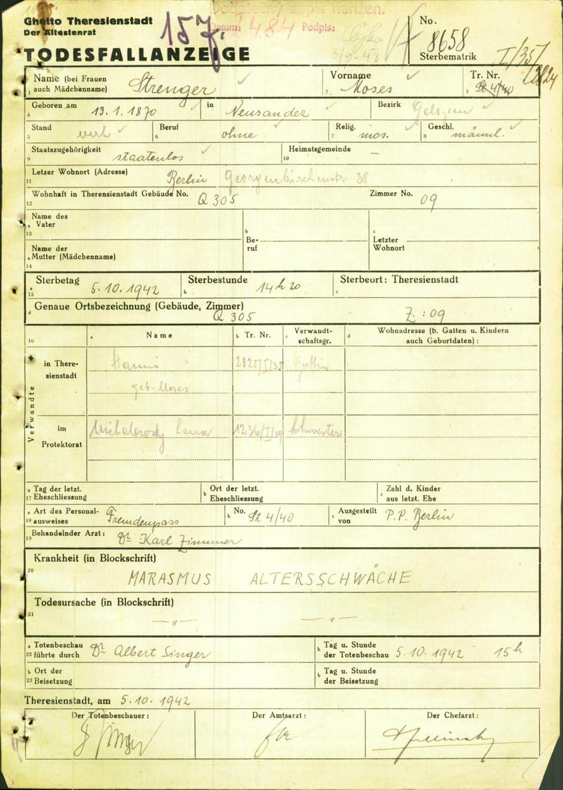 Strenger Moses: Todesfallanzeige, Ghetto Theresienstadt