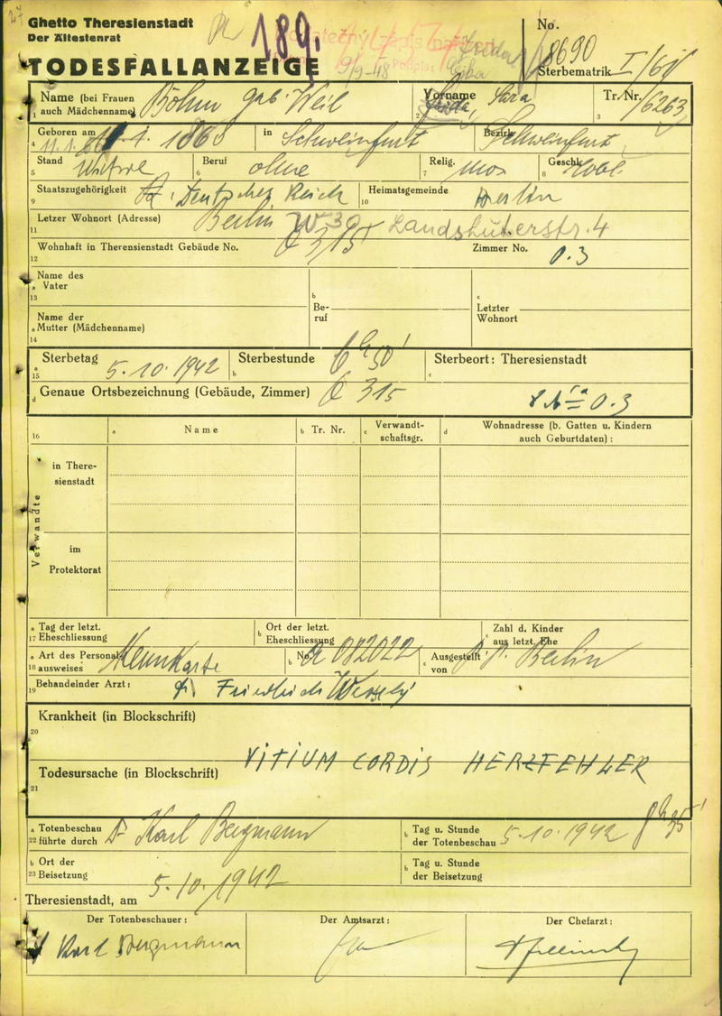 Böhm Friederike: Todesfallanzeige, Ghetto Theresienstadt