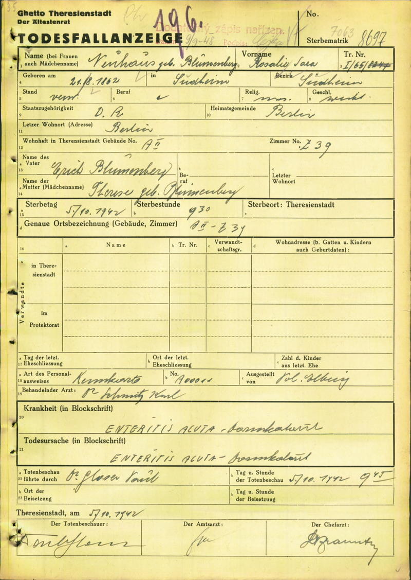Neuhaus Rosalie: Todesfallanzeige, Ghetto Theresienstadt