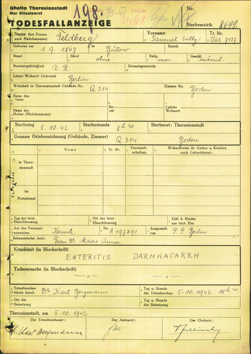Feldberg Samuel: Todesfallanzeige, Ghetto Theresienstadt