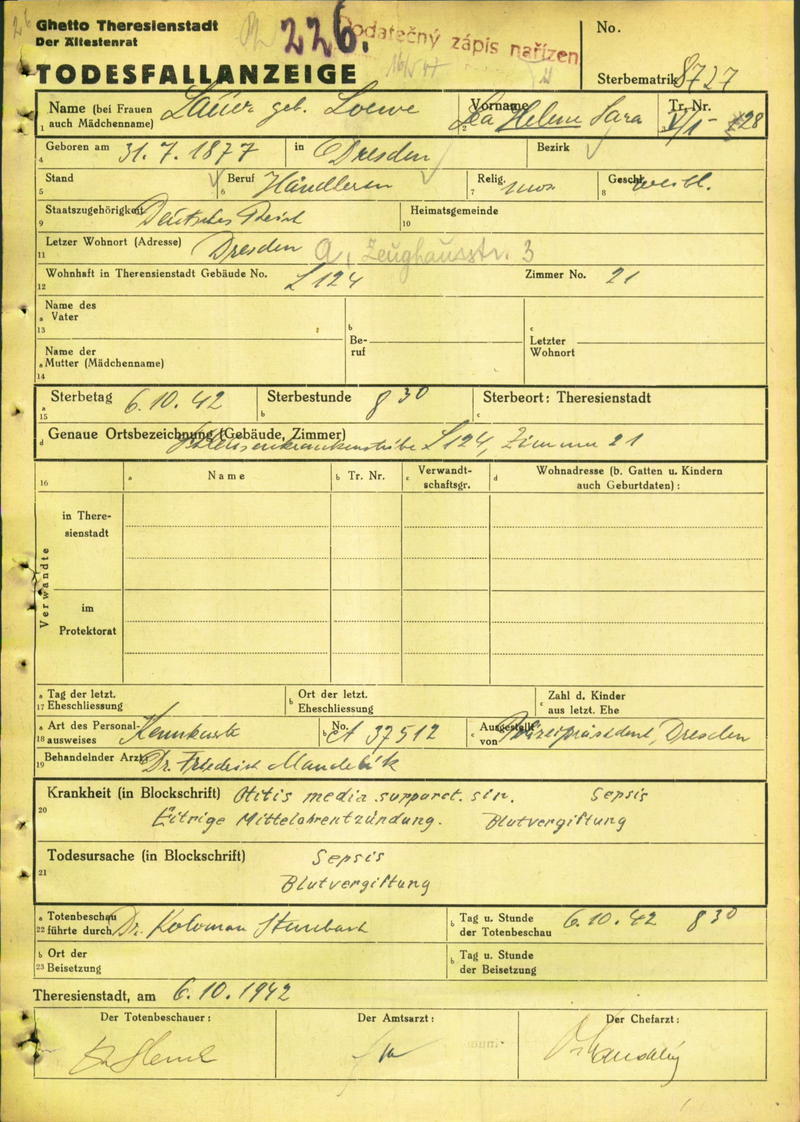 Lauer Helene: Todesfallanzeige, Ghetto Theresienstadt