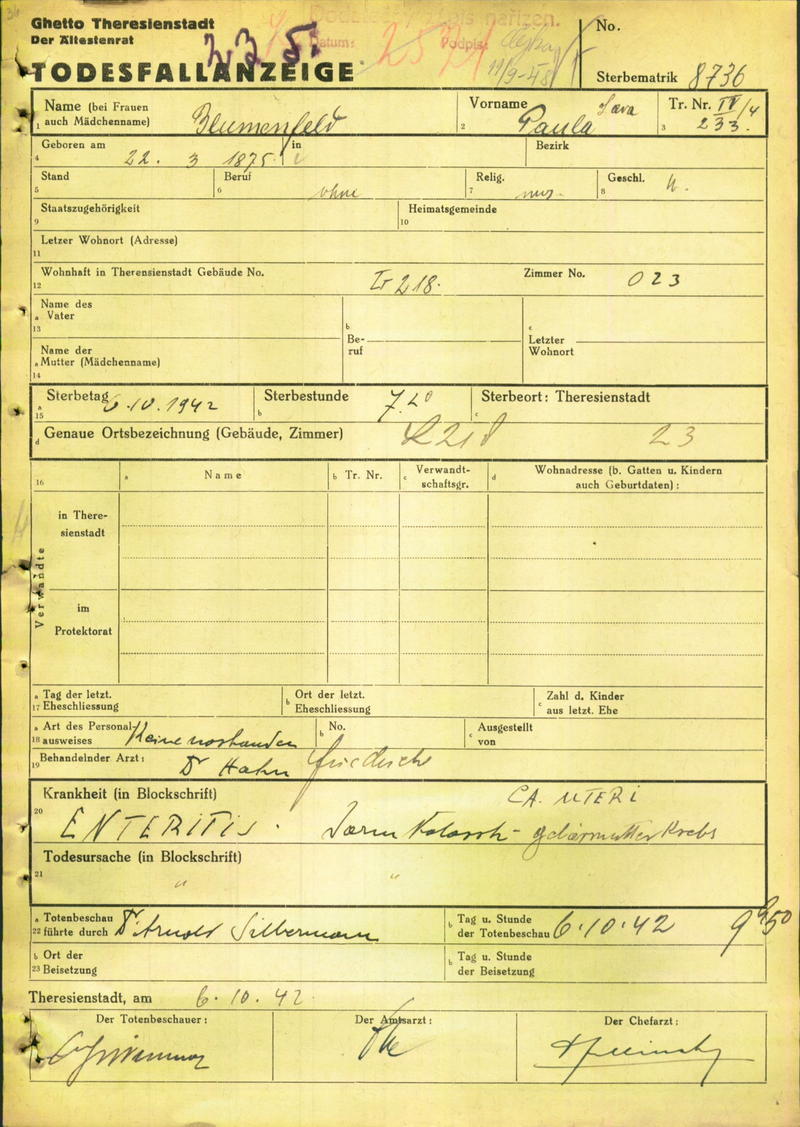 Blumenfeld Paula: Todesfallanzeige, Ghetto Theresienstadt