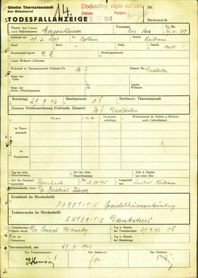 Mergentheimer Rosa: Todesfallanzeige, Ghetto Theresienstadt