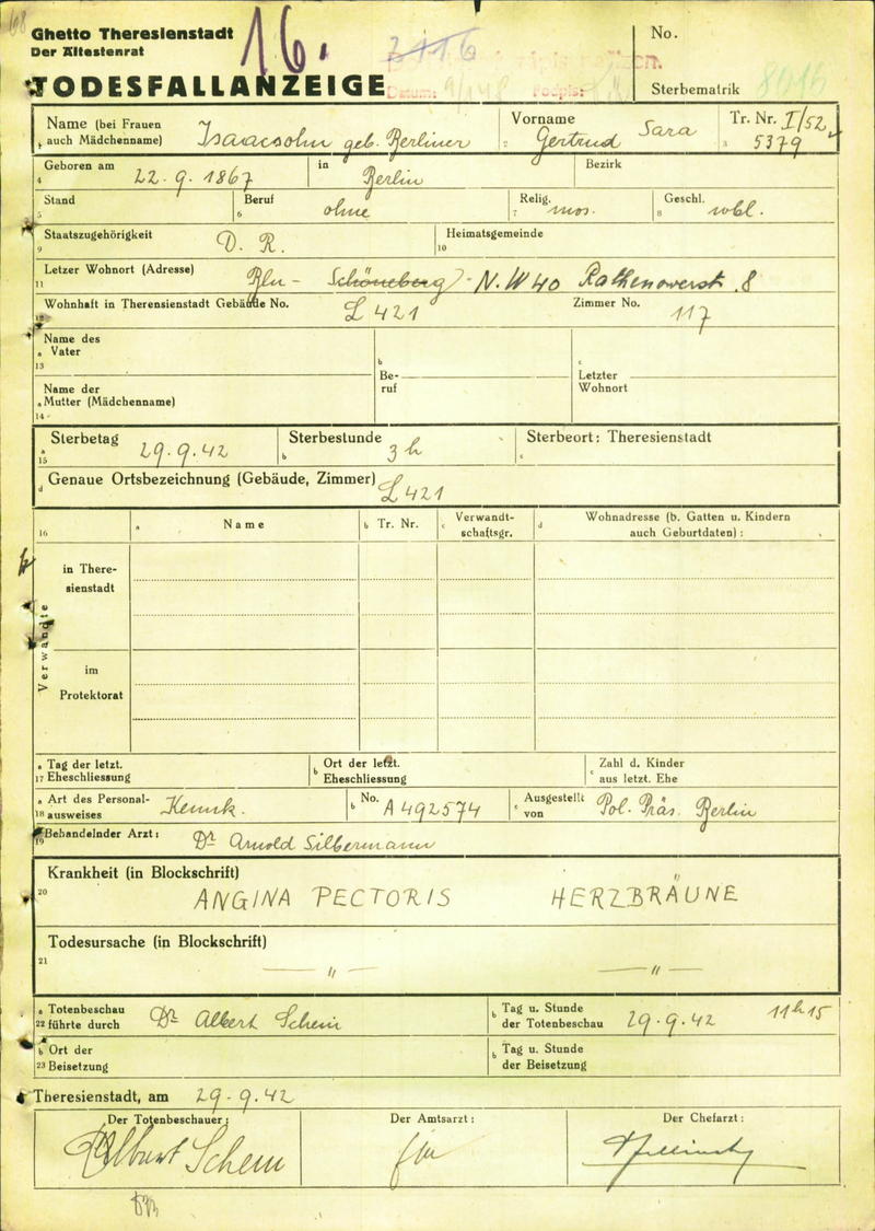 Isaacsohn Gertrud: Todesfallanzeige, Ghetto Theresienstadt