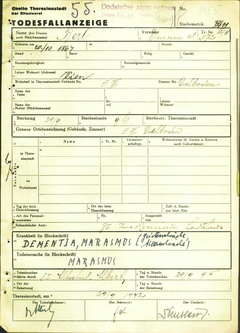 Berl Emma: Todesfallanzeige, Ghetto Theresienstadt