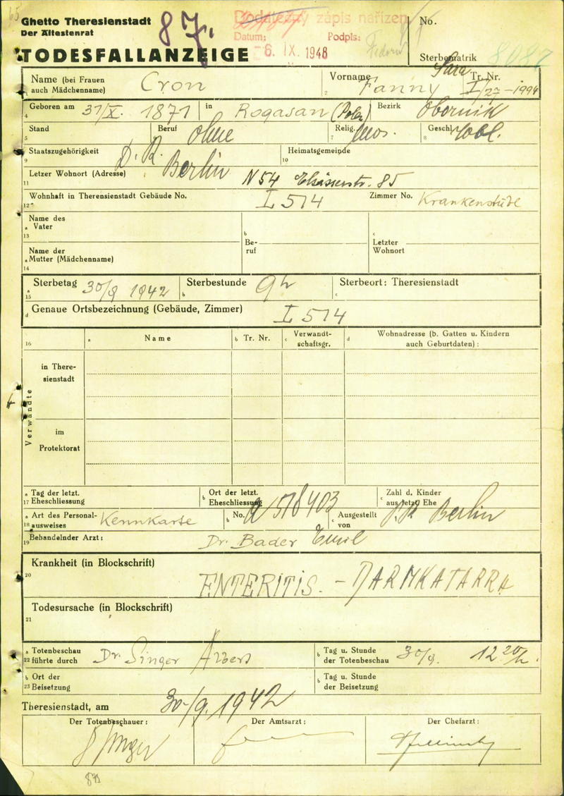 Cron Fanny: Todesfallanzeige, Ghetto Theresienstadt