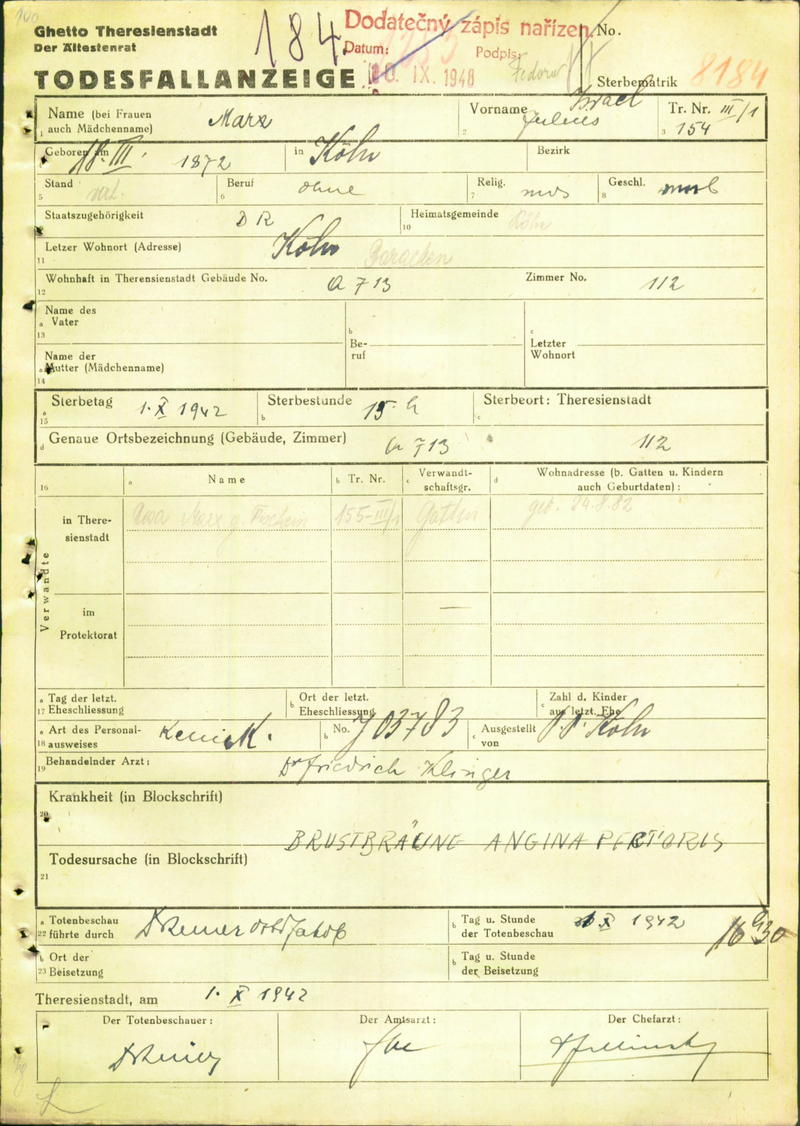 Marx Julius: Todesfallanzeige, Ghetto Theresienstadt
