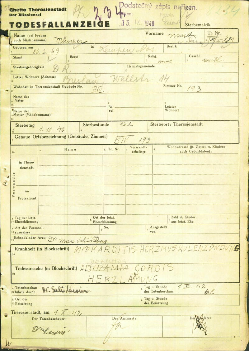 Münzer Martha: Todesfallanzeige, Ghetto Theresienstadt