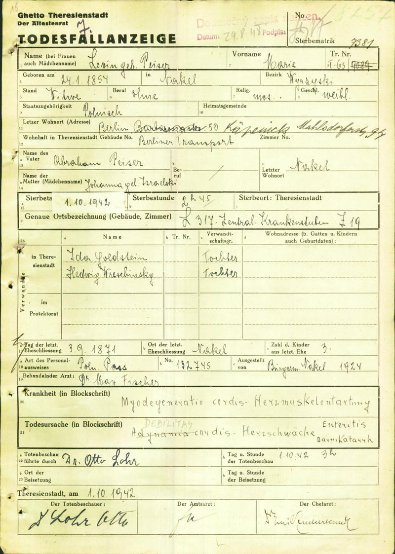 Levin Marie: Todesfallanzeige, Ghetto Theresienstadt
