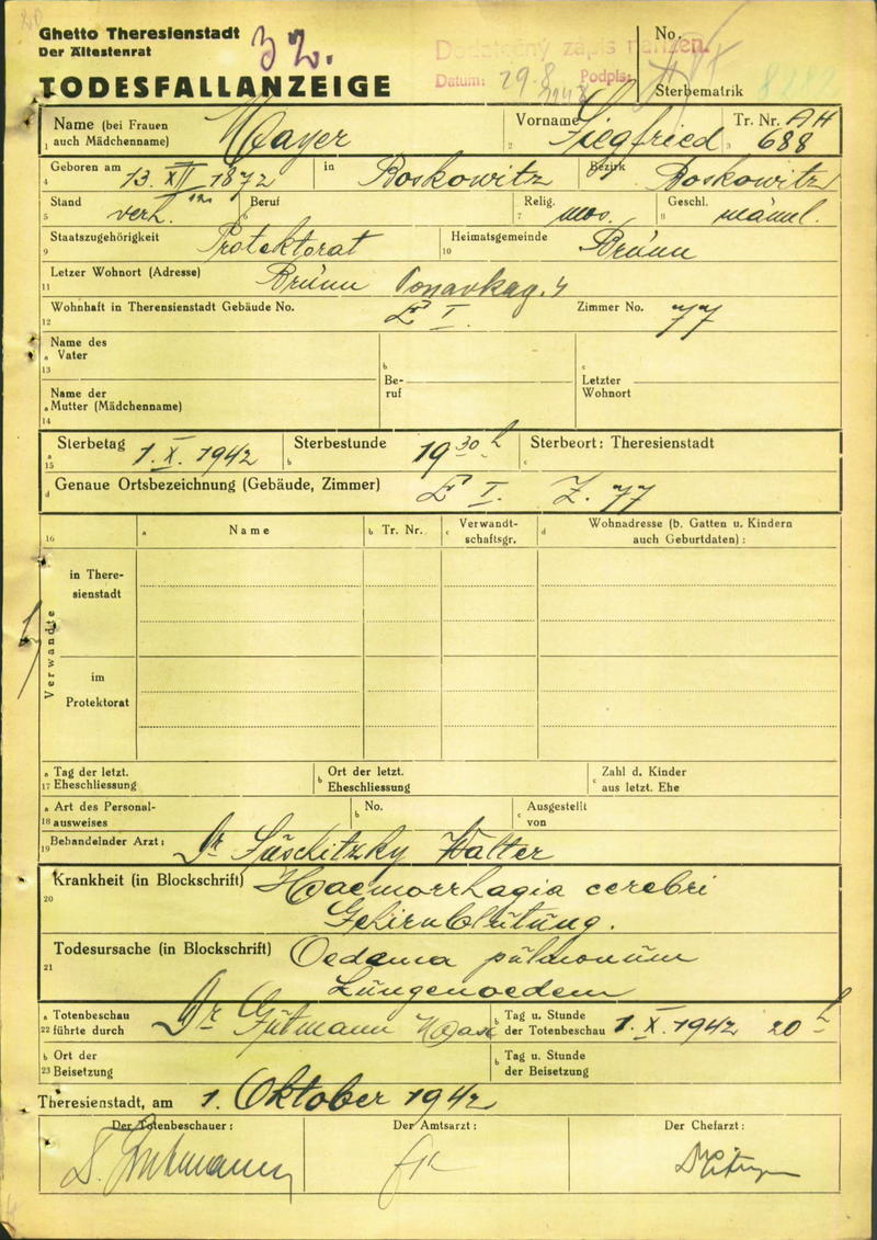 Mayer Siegfried: Todesfallanzeige, Ghetto Theresienstadt