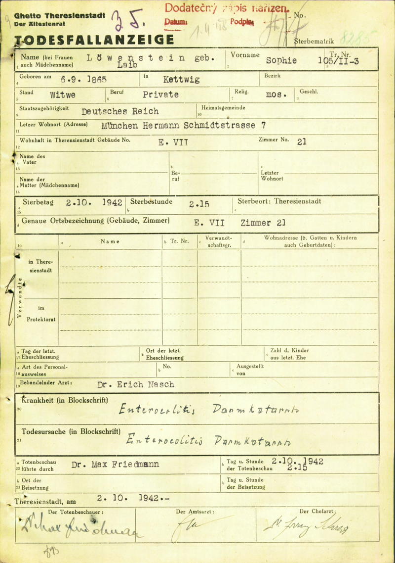 Löwenstein Sophie: Todesfallanzeige, Ghetto Theresienstadt