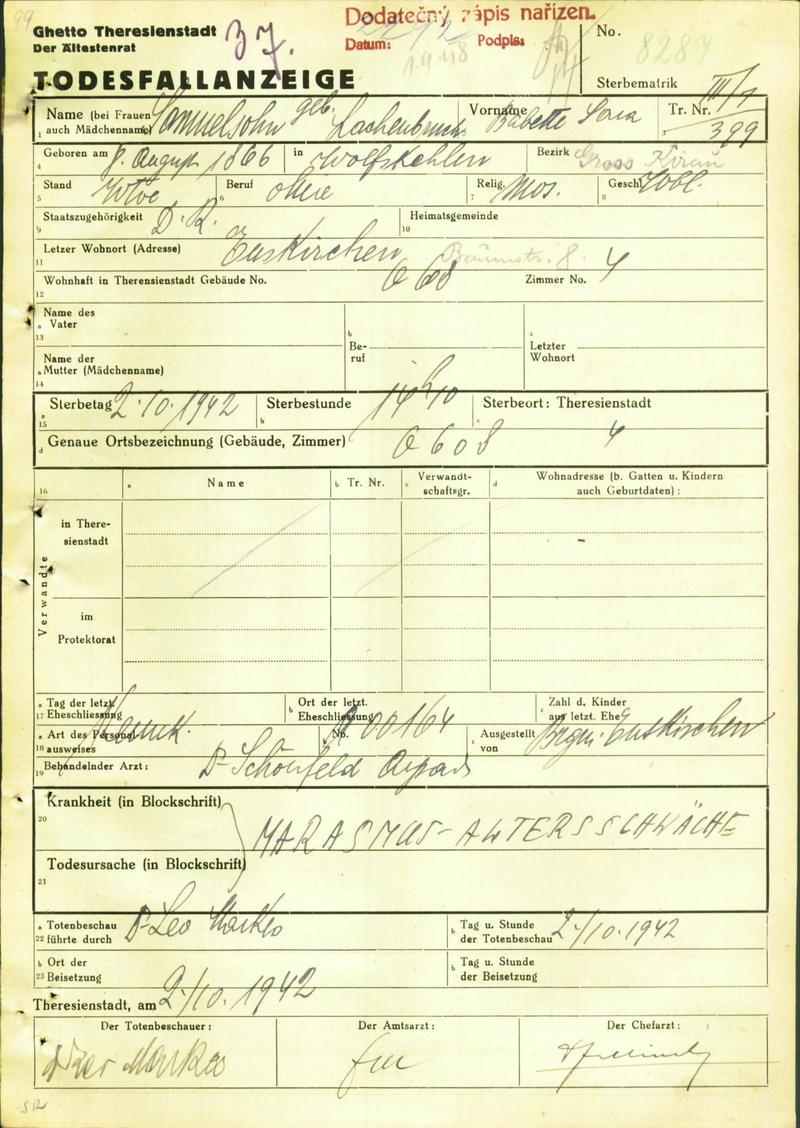 Samuelsohn Babette: Todesfallanzeige, Ghetto Theresienstadt
